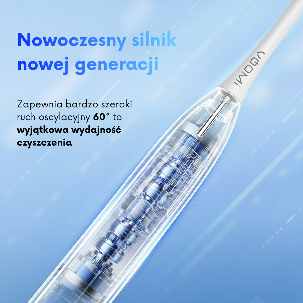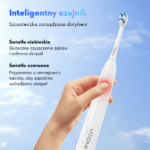 Szczoteczka soniczna Vibe 1S oferuje 6 trybów czyszczenia, inteligentne dopasowanie mocy i Sonic Wave 60° dla głębokiej higieny. Antybakteryjne końcówki DuPont i gumowany tył główki chronią dziąsła i pomagają czyścić język. Bateria wystarcza nawet na 100 dni.