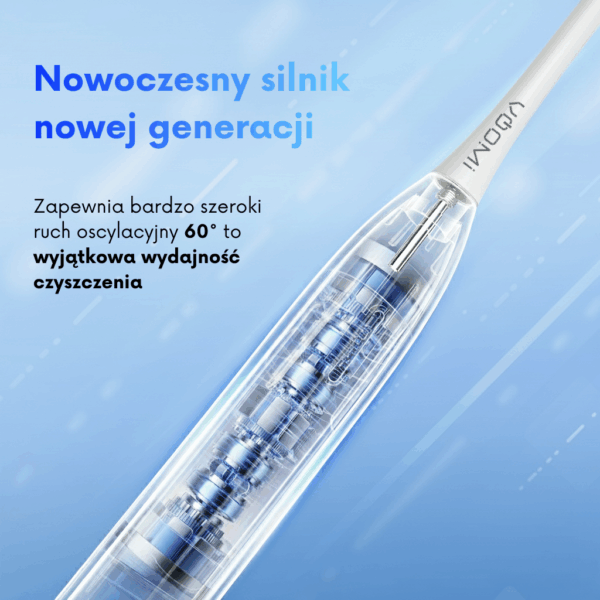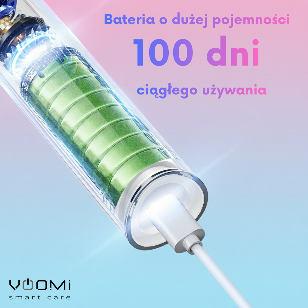 Tryb Polerowania – finalna pielęgnacja nadająca zębom gładkość i blask - Długi Czas Pracy Baterii: Akumulator o pojemności 2000 mAh zapewnia do 100 dni ciągłego użytkowania na jednym ładowaniu (przy założeniu 2 min, 2 razy dziennie). Pełne ładowanie zajmuje około 6 godzin.