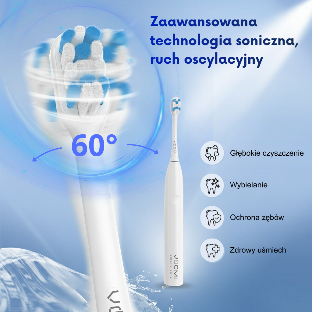 - Sonic Wave Technology (Technologia Fali Soncznej): Ruch oscylacyjny o szerokim kącie 60° połączony z wysoką częstotliwością wibracji: do 38 000 ruchów/minutę dla mocnego, głębokiego czyszczenia.