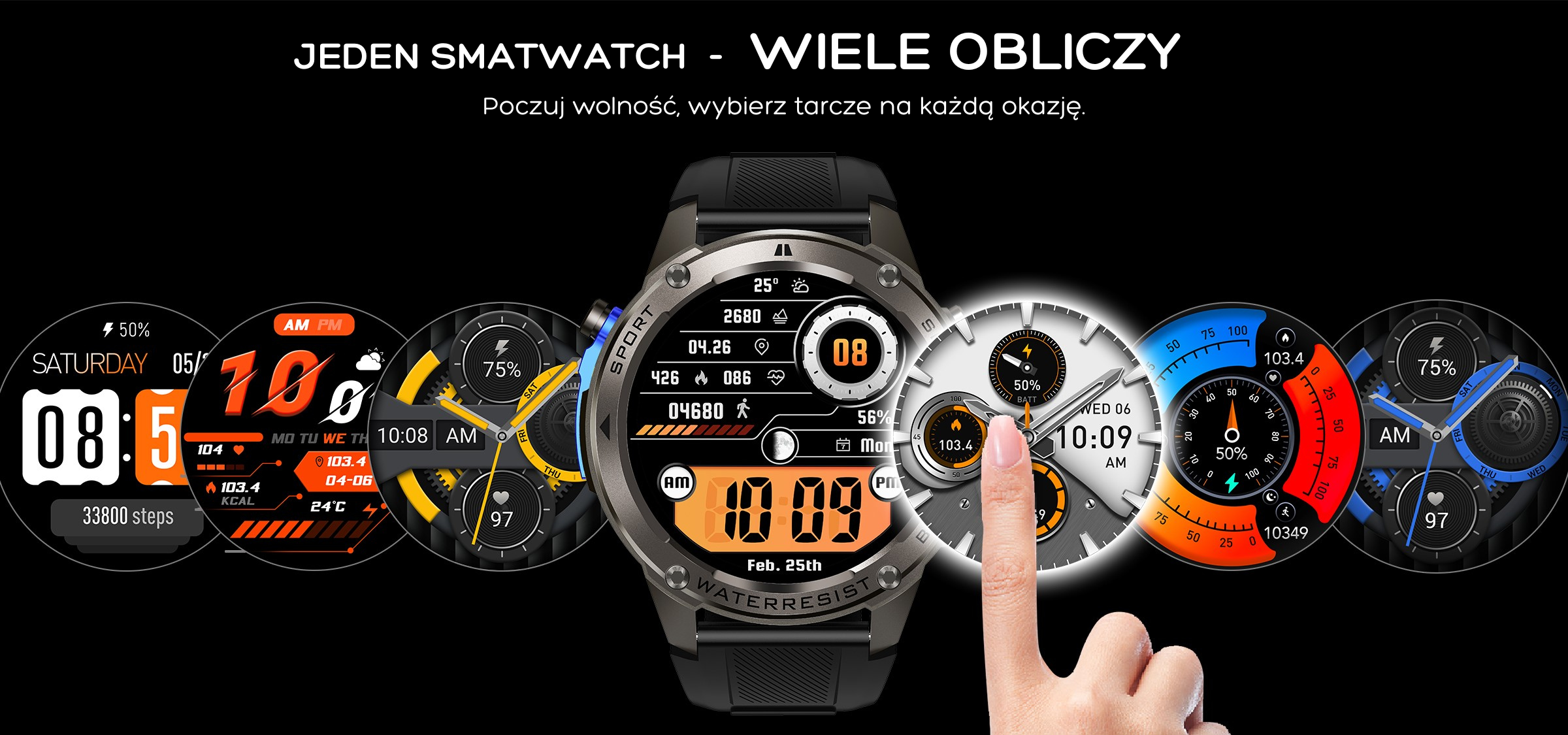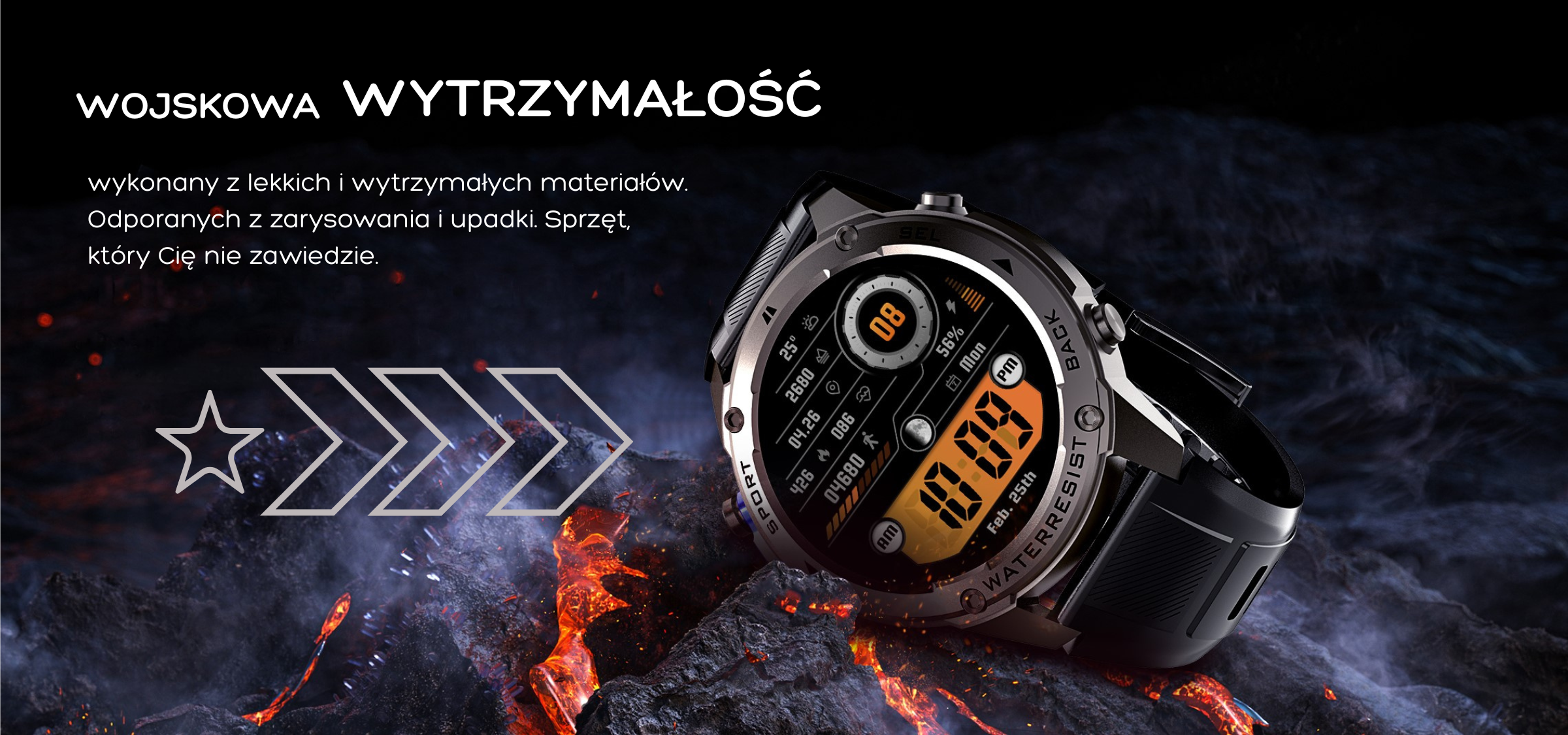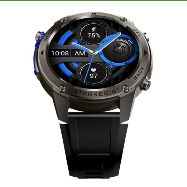 Z certyfikatem 5ATM IP69K, smartwatch jest odporny na wodę aż do 50 m, zgodny ze standardem militarnym nie straszny mu kurz i warunki terenowe.
