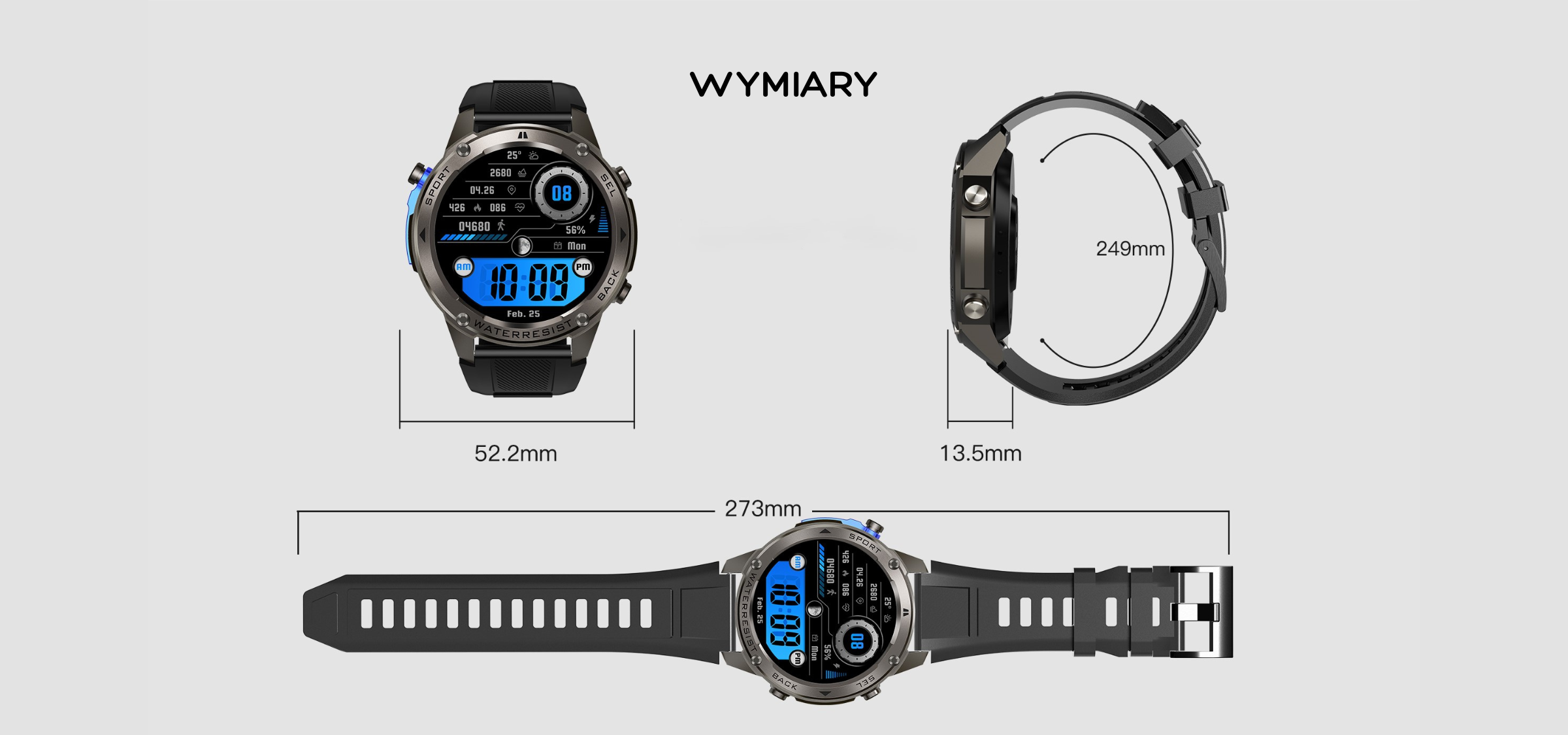 | Wymiary i Waga: | Wymiary koperty: 57.5mm x 52.5mm x 13.5mm Waga: ~63g (sam zegarek), ~85g (z paskiem) |