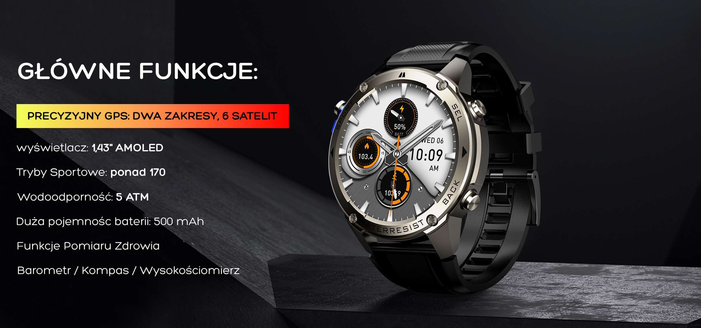 | Przyciski: | 3 fizyczne przyciski: włącz/wyłącz (SOS), funkcyjny (konfigurowalny), skrót do sportu |
