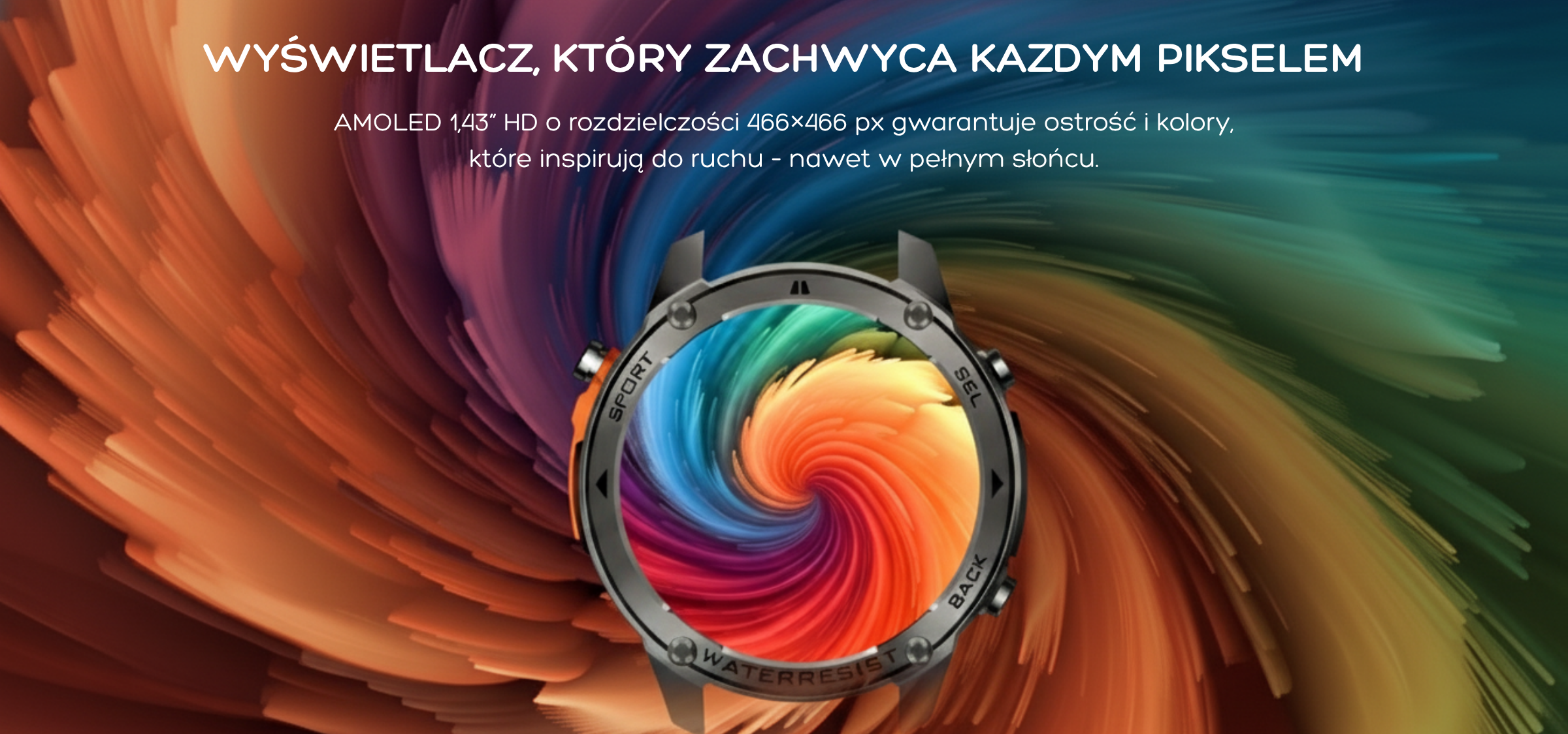 Wyświetlacz AMOLED: 1.43 cala, wysoka rozdzielczość 466×466 pikseli dla kryształowo czystego obrazu.